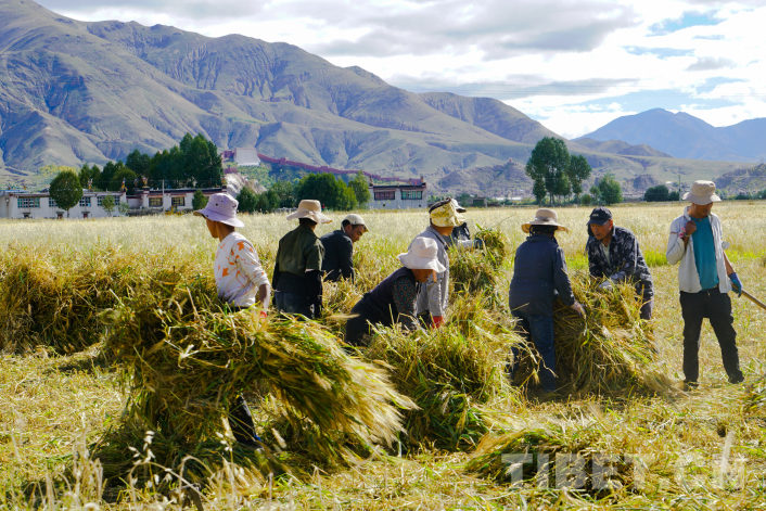 圖為日喀則市江孜縣江熱鄉(xiāng)江熱村正在幫助巴桑干農(nóng)活的村民 攝影:王淑