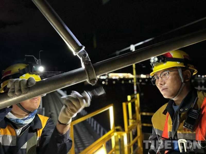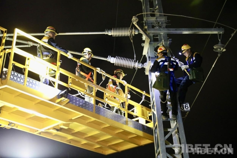 23時00分,軌道車穩(wěn)穩(wěn)???,“天窗”作業(yè)命令下達。中國鐵路青藏集團有限公司拉薩基礎(chǔ)設(shè)施段供電維修技術(shù)中心拉薩南接觸網(wǎng)維修隊工長李積王帶著7名工友走下接觸網(wǎng)作業(yè)車,驗電、連接地線端、接掛地線……一系列操作一氣呵成。隨即,現(xiàn)場負(fù)責(zé)人拉加和工友們依次登上距離地面6米高的作業(yè)平臺上,穿梭于接觸網(wǎng)線索之間,猶如凌空“舞者”。