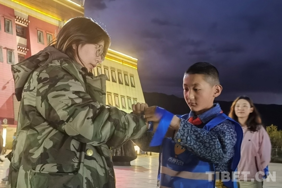 夜幕降臨,研學(xué)游團(tuán)隊(duì)來到文成公主劇場(chǎng)。穿上藍(lán)馬甲,孩子們搖身一變成了文明旅游的小小宣傳員。帕里鎮(zhèn)小學(xué)注重培養(yǎng)學(xué)生的生態(tài)文明意識(shí),自2023年7月起,主動(dòng)加入“美麗公約”志愿組織的“擦亮天路行動(dòng)”。學(xué)生定期在帕里鎮(zhèn)清理垃圾,也會(huì)為沿國(guó)道562來到帕里的游客宣傳垃圾隨身走的文明旅游理念。今天,來到拉薩,孩子們?cè)俅问炀毜叵騽?chǎng)周圍的觀眾宣傳起來,一邊為大家在右臂系上代表文明旅游承諾的藍(lán)絲帶,一邊鼓勵(lì)“一起守護(hù)第三極,因?yàn)橛心?,中?guó)更美”。一時(shí)間,文成公主劇場(chǎng)周圍成為了藍(lán)絲帶的海洋。