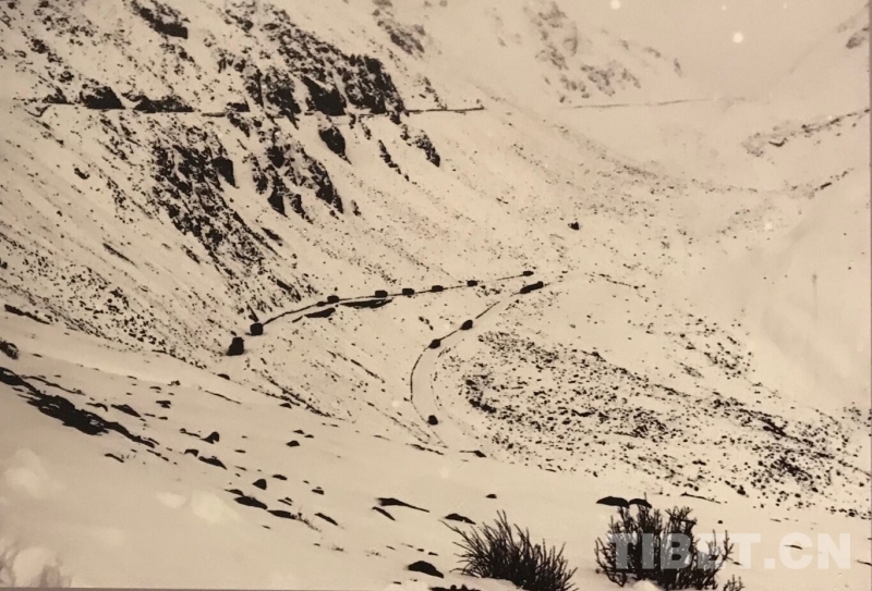 圖為第17屆西藏珠穆朗瑪攝影大展展出的藍(lán)志貴于1951年進(jìn)軍西藏途中所拍攝的《翻越泥巴山》 翻拍:王淑