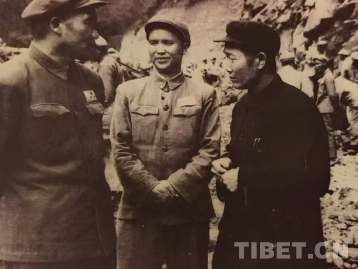 圖為1953年秋,西南軍區(qū)副司令員兼參謀長李達(dá)代表賀龍司令員慰問川藏公路筑路部隊官兵,陳明義(中)、穰明德陪同李達(dá)(左一)在西藏波密視察公路修建進(jìn)展 圖由陳亦軍提供