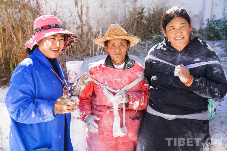 “布達(dá)拉宮外墻的白色涂料主體是來源于拉薩市當(dāng)雄縣羊八井和日喀則市仁布縣一帶的高嶺土,也就是我們通常所說的白灰。為了保證涂料的黏性和光澤度,在白灰兌上水后,我們會(huì)加入牛奶、白糖、牛骨膠、植物膠等配料。這些配比都是由長期從事布達(dá)拉宮文物保護(hù)的工匠來操作的,每種原材料的比例都是經(jīng)過匠人們長期的經(jīng)驗(yàn)積累所總結(jié)出的最佳配比方案。我們經(jīng)常會(huì)遇到群眾在幫忙的過程中在配比好的涂料中加入自己隨身攜帶來的牛奶等物,我們能夠理解群眾善良質(zhì)樸的心情,但其實(shí)改變了涂料配比后原有的黏度、光澤度都會(huì)改變,是不利于文物保護(hù)的?!边叞铜傔_(dá)說布達(dá)拉宮管理處每年都會(huì)在粉刷季向群眾和游客科普文物保護(hù)知識(shí),希望群眾和游客在參與粉刷之時(shí)能夠遵守秩序,共同保護(hù)好這一文化遺產(chǎn)。
