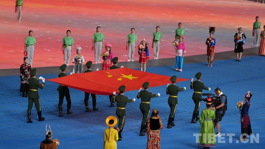 圖為中華人民共和國(guó)國(guó)旗在開(kāi)幕式上入場(chǎng) 攝影:德吉卓瑪
