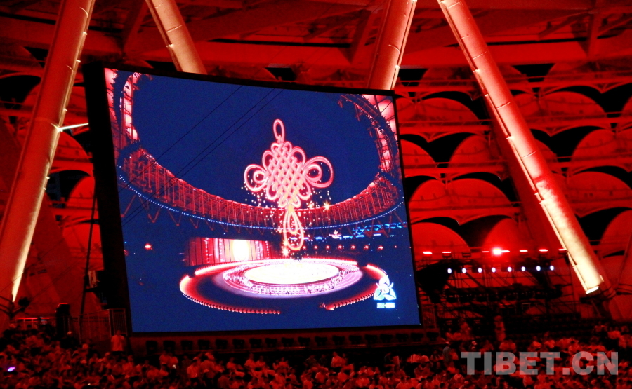 圖為第十二屆全國(guó)少數(shù)民族傳統(tǒng)體育運(yùn)動(dòng)會(huì)開幕式上以高科技方式呈現(xiàn)的中國(guó)結(jié) 攝影:劉莉