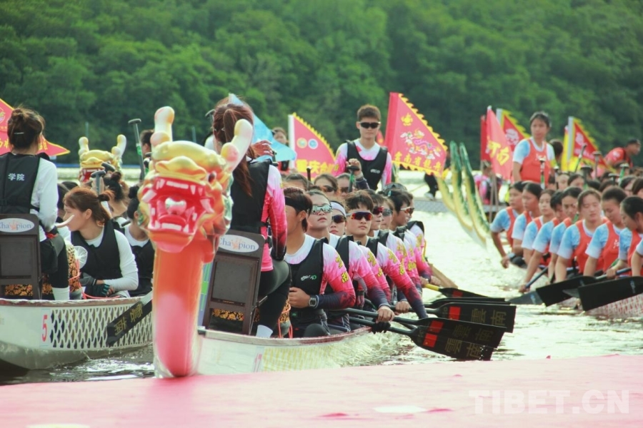 圖為第十二屆全國少數(shù)民族傳統(tǒng)體育運(yùn)動會龍舟項(xiàng)目各參賽隊(duì)蓄勢待發(fā) 攝影:劉莉