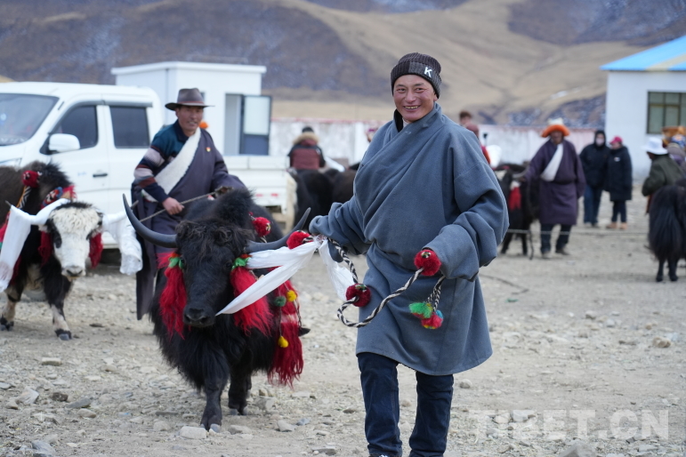 圖為藏比鄉(xiāng)昂倉(cāng)村合作社分紅現(xiàn)場(chǎng)一家一戶分到一頭牦牛