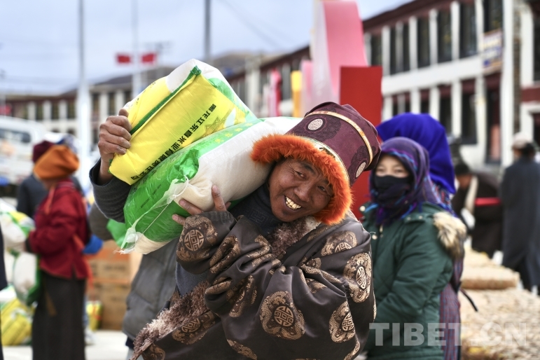 圖為藏比鄉(xiāng)那查村合作社分紅現(xiàn)場(chǎng)每戶分到糌粑、米、面、油等“大禮包”