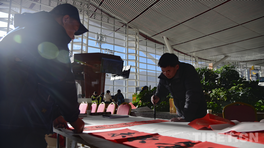 拉薩貢嘎國際機(jī)場內(nèi),映入眼簾的是航站樓二樓大廳里“點(diǎn)亮夢想 為愛起航”——西藏自治區(qū)文藝志愿服務(wù)活動走進(jìn)貢嘎國際機(jī)場航站樓巨型廣告牌,藍(lán)天白云、雪山航線的畫面充滿了文藝范兒,格外醒目,吸引了不少旅客的目光。大廳西側(cè)的志愿者們現(xiàn)場揮毫潑墨,為旅客書寫寓意吉祥的“?!弊趾驮⒁庾85摹霸鞯吕铡?,并將這些蘊(yùn)含著美好祝愿的書法作品免費(fèi)贈送給旅客,為他們的旅途增添了更多的溫暖和祝福。