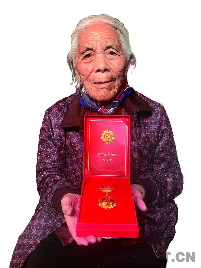 圖為巴西老人展示她的光榮在黨50年紀念章