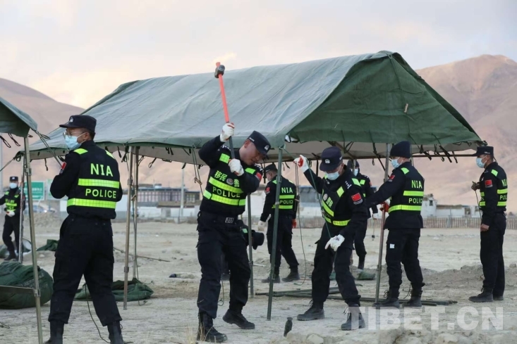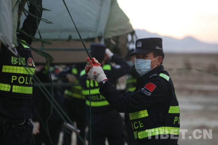 圖為西藏移民管理警察為受災群眾搭建帳篷 攝影:郭遠敬