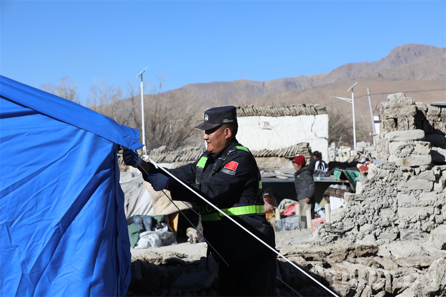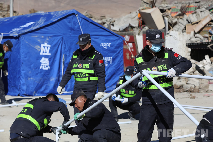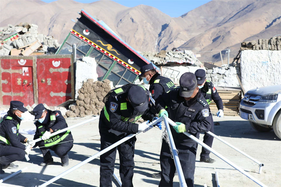 圖為西藏移民管理警察在定日縣長所鄉(xiāng)雜村為受災(zāi)群眾安裝帳篷 攝影:郭遠(yuǎn)敬