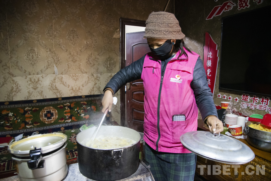 在楚卡村12歲以下的兒童、60歲以上的老人,以及一直以來工作在村安置點一線的工作人員共計70余人的三餐都由這個小小的廚房供給。達娃央宗說:“平常我們也會做一些酥油茶送給村中的老人,和他們喝茶聊天,就是給他們心理輔導?!?/p>