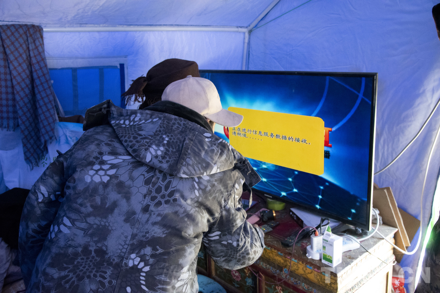 圖為楚卡村安置點村民正在帳篷內(nèi)調(diào)試電視機 攝影:趙振宇