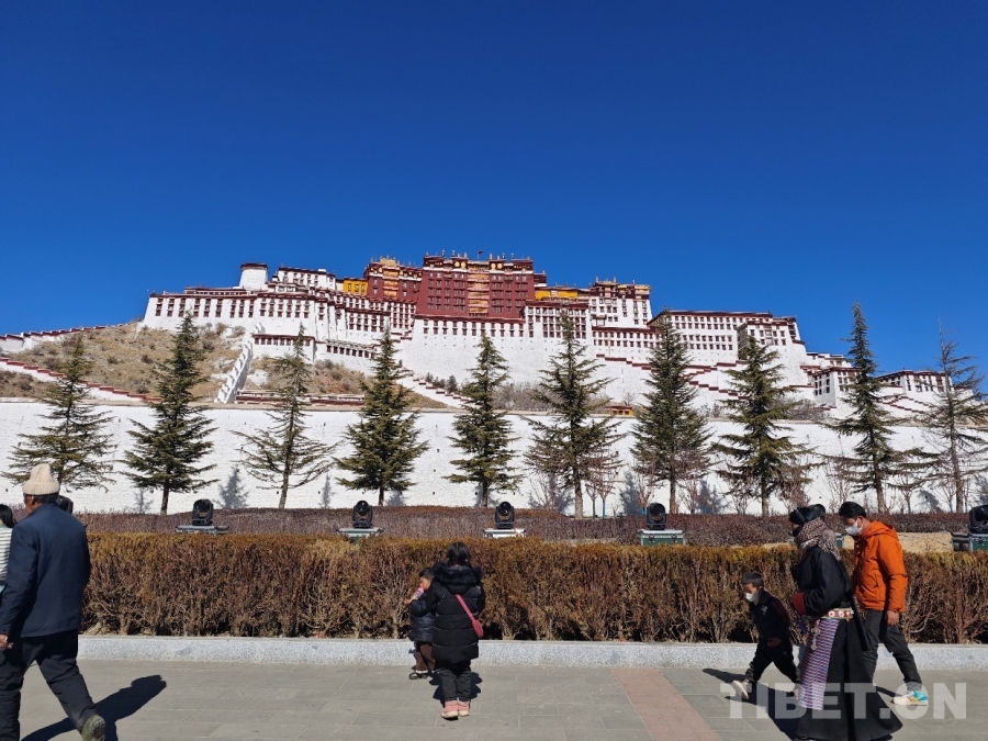 圖為在布達拉宮前行走的人們 攝影:趙婧茹
