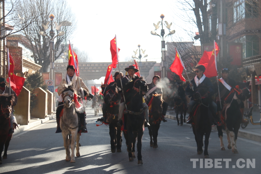 馬術(shù)巡游隊(duì)伍來(lái)到理塘東山頂上,俯瞰縣城全景,并展開(kāi)祝福橫幅,用藏漢雙語(yǔ)高聲祝愿全國(guó)各族人民新春吉祥。