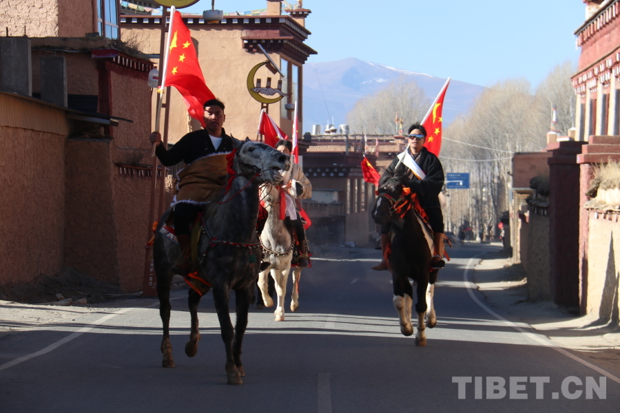 高城鎮(zhèn)、村戈鄉(xiāng)以及縣賽馬協(xié)會(huì)的30余名騎手,身著嶄新的藏族服飾,手擎鮮艷的五星紅旗,騎著紅綢裝扮的駿馬,在街市上列隊(duì)巡游,馬蹄聲聲鏗鏘有力。巡游道路兩旁,裝飾著燈籠和彩旗,節(jié)日氛圍濃厚。附近的居民群眾紛紛出門(mén)駐足觀看,鼓掌拍照,現(xiàn)場(chǎng)一片歡聲笑語(yǔ)。
