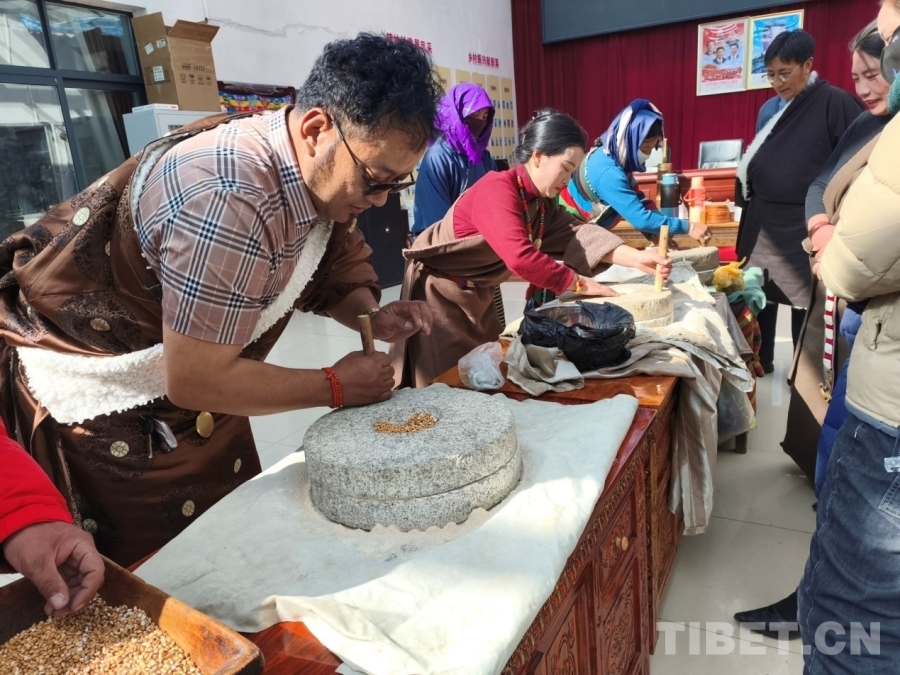 圖為手工磨糌粑比賽