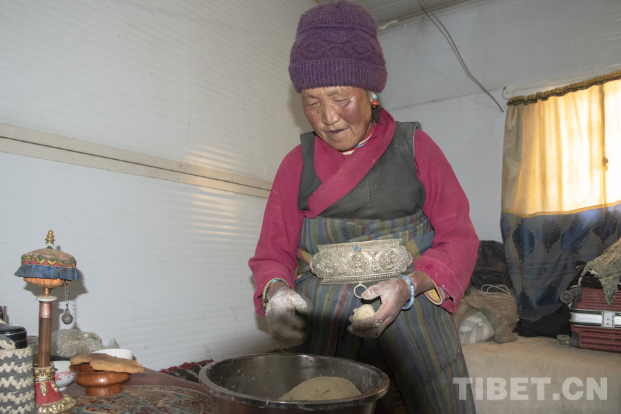 圖為定日縣曲洛鄉(xiāng)嘎白村村民格桑正在制作“古突”所需要的面疙瘩 攝影:趙振宇