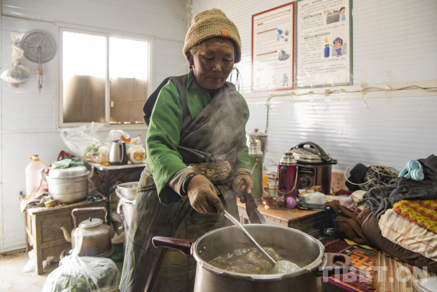 “莫啦(藏語(yǔ)意為‘奶奶')家里的年輕人現(xiàn)下都在村里忙著重建,兩位老人在家里做好‘古突’等著孩子們回家!”