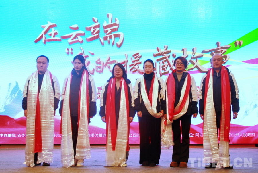 圖為“在云端·我的援藏故事”涉藏州縣行活動(dòng)在四川省阿壩州松潘縣進(jìn)行宣講,6位優(yōu)秀援藏干部人才身披羌紅和哈達(dá)合影 攝影:劉莉