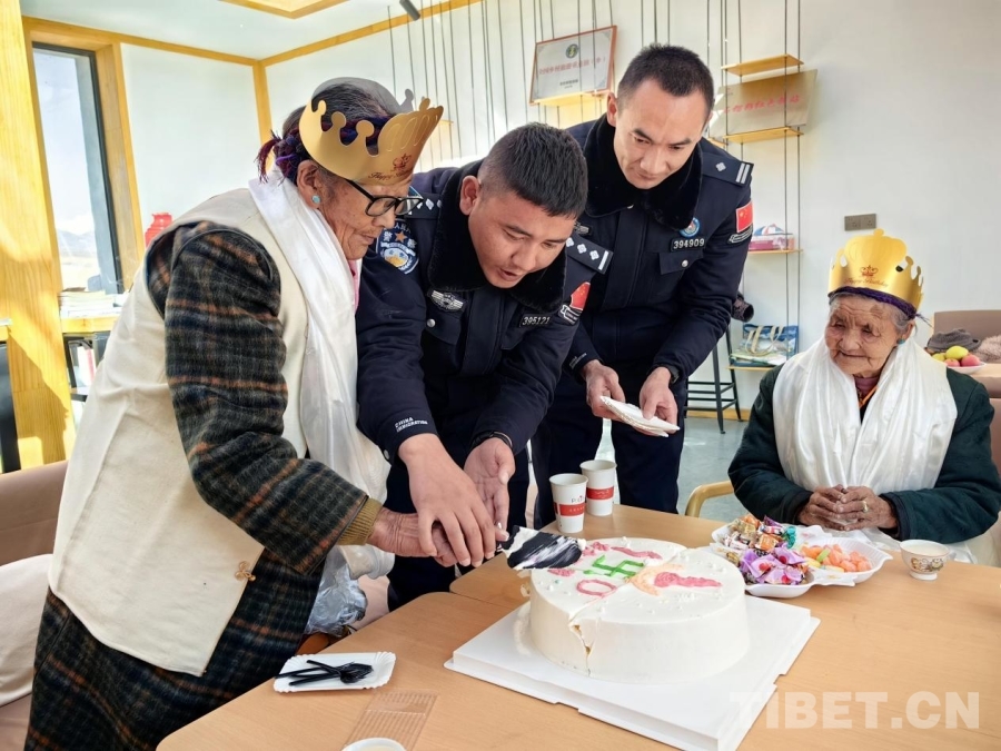 活動(dòng)中,警民攜手為老人們精心準(zhǔn)備了一場(chǎng)慶祝派對(duì),邊防民警、社區(qū)兩委班子成員、駐村工作隊(duì)隊(duì)員為老人獻(xiàn)上祝福的歌曲,定做精美的蛋糕,穿上代表高壽的藏式服裝等,并與老人們嘮家常,傾聽他們的生活故事和需求。