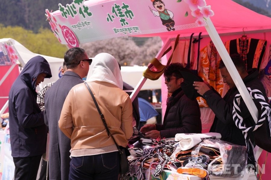沿著蜿蜒的小路,一邊是錯落有致的桃花樹,一邊是特色集市?!斑@些是工布男女服飾、這是馬套、這是藏式包包……都是我們合作社的工作人員手工制作的?!痹谖枧_一旁的桃花小集市,林芝市巴宜區(qū)絲綢藏裝定制農(nóng)牧民專業(yè)合作社負責人尼瑪扎西正向游客一一介紹自家展銷點的產(chǎn)品以及其背后的文化和制作過程。經(jīng)過一番討價還價,一千余元的“大單子”順利成交,游客將一件件精美的巴宜“小禮品”裝進袋子和尼瑪扎西揮手告別。