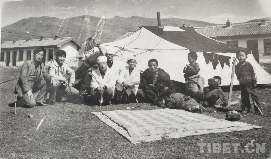 圖為20世紀(jì)80年代,王萬青(左五)和群眾在阿萬倉(cāng)衛(wèi)生院內(nèi)帳篷前的合影 翻拍:易文文