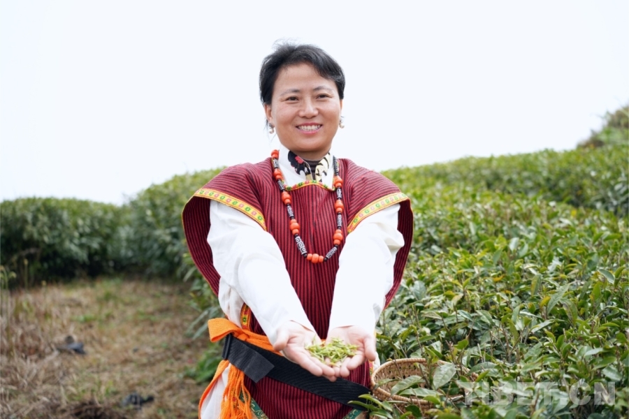 圖為格林村村民卓瑪曲宗展示她剛采摘下的新茶(2025年3月攝) 攝影:邊子捷