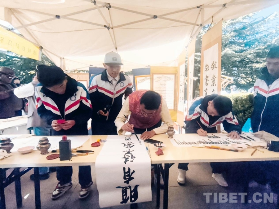 圖為4月19日,第二屆“拉薩春日書會(huì)”宗角祿康公園主會(huì)場內(nèi),拉薩江蘇實(shí)驗(yàn)中學(xué)書法社的同學(xué)們在撰寫書法作品 攝影:趙釗