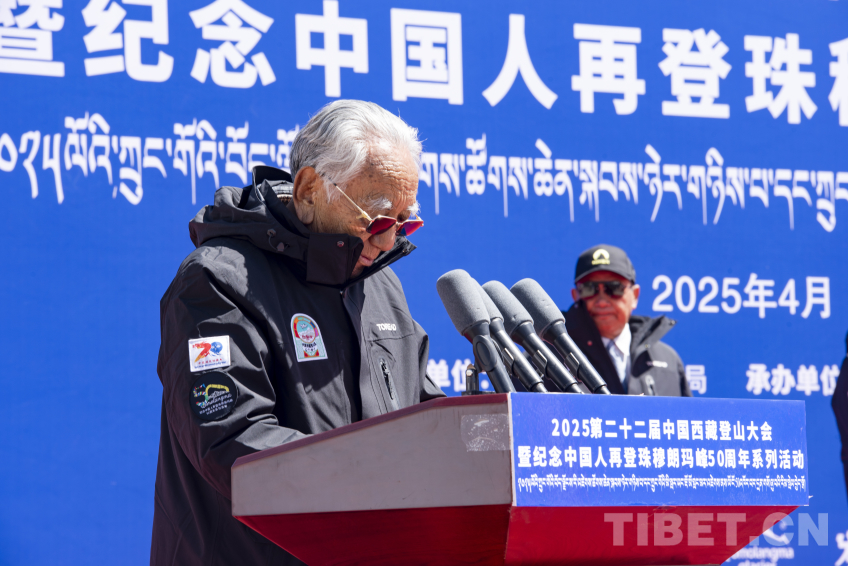 圖為老登山家代表、1975年中國人再登珠峰成員、珠峰“九勇士之一”羅則致辭 攝影:趙振宇
