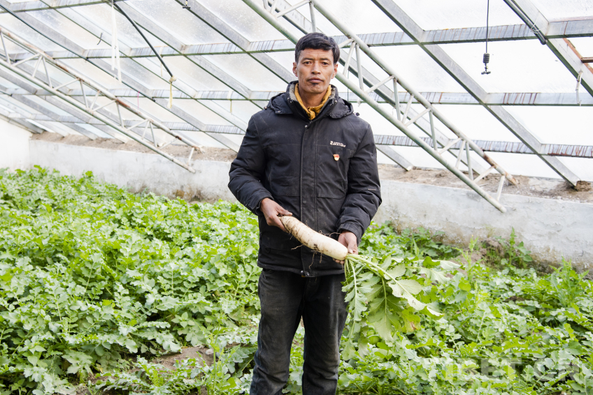 圖為定日縣長所鄉(xiāng)嘎旦村村委會主任頓珠在震后修繕的蔬菜溫室大棚內為記者展示棚內種植出的白蘿卜 攝影:趙振宇