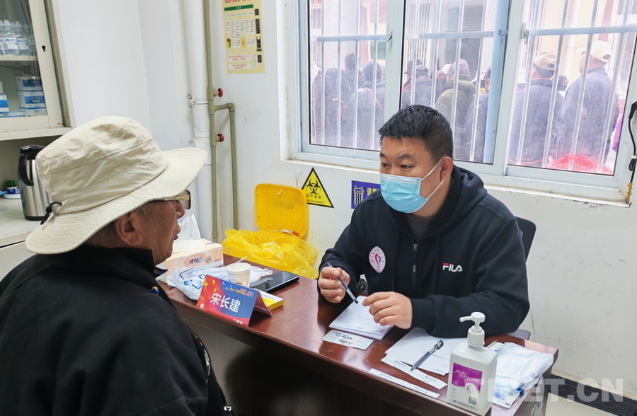 圖為火箭軍特色醫(yī)學中心口腔科醫(yī)師宋長建在義診中詢問就醫(yī)群眾病情 攝影:馬濤