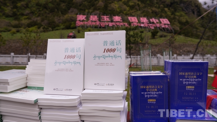 圖為《普通話(huà)1000句》漢藏對(duì)照版、《國(guó)家通用語(yǔ)言文字學(xué)習(xí)詞典》(藏文對(duì)照)等書(shū)籍