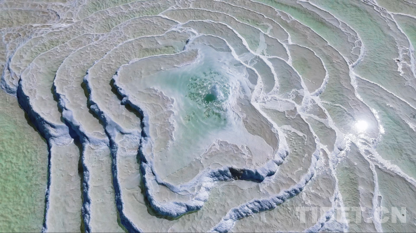 圖為察爾汗鹽湖內(nèi)的鹽池。在一些將要干涸的鹽池上,湖水表面會(huì)飄蕩著鹽花結(jié)晶,同時(shí)池底也會(huì)結(jié)晶為層層鹵石,這種鹵石的硬度很高,性質(zhì)也較為穩(wěn)定,足以修建成道路供行人車(chē)輛通行 供圖:青海省文化和旅游廳