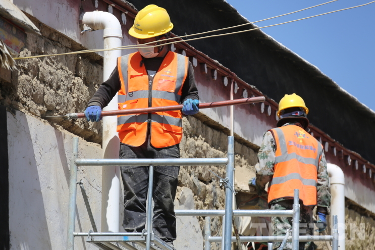 圖為日喀則市拉孜縣錫欽鄉(xiāng)崗西村,民房正在進行維修加固