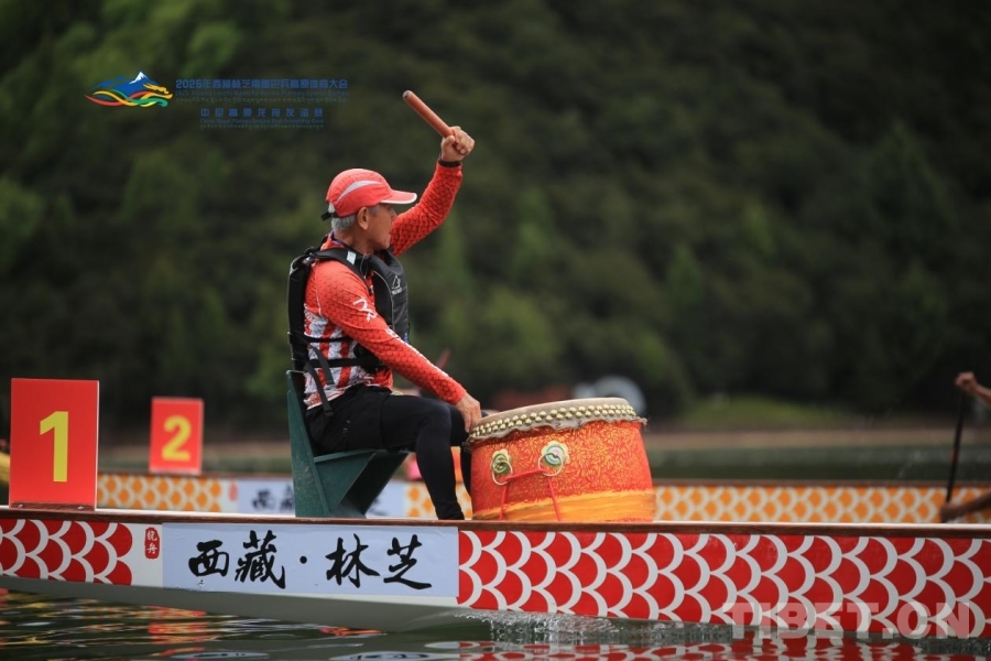 6月15日,“2025年西藏林芝南迦巴瓦高原體育大會——中尼高原龍舟友誼賽”在西藏林芝魯朗開賽。圖為新加坡S.G Dragon龍舟隊領隊Jackie在比賽中擊鼓 主辦方供圖