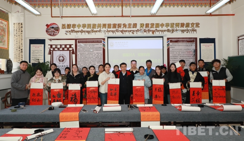 走進(jìn)西藏民族大學(xué)社科樓里內(nèi)的“鑄牢中華民族共同體意識書法實(shí)踐基地”,基地負(fù)責(zé)人扎西曲杰正帶領(lǐng)他的小伙伴書寫書法作品。指著一幅幅書法作品,扎西曲杰自豪地說,我們基地的各族學(xué)生用“寫”在一起的形式傳承中華優(yōu)秀傳統(tǒng)文化,推廣國家通用語言文字,助力中華民族共同體建設(shè)。