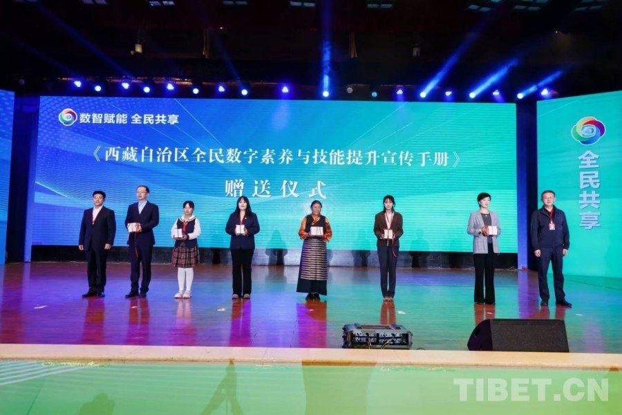 圖為活動(dòng)現(xiàn)場向社會(huì)各界代表贈(zèng)送《西藏自治區(qū)全民數(shù)字素養(yǎng)與技能提升宣傳手冊(cè)》
