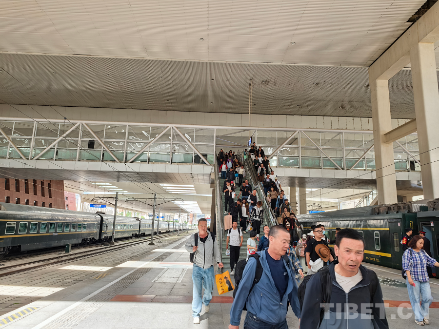 圖為拉薩火車站暑運首日旅客在站臺乘車離藏