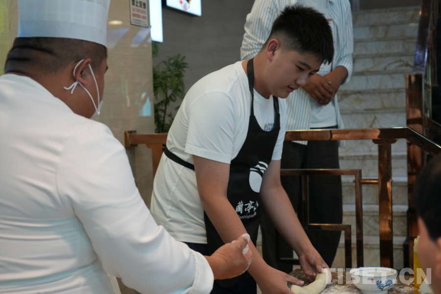 圖為胡俊賢在拉面師傅的指導下制作拉面 攝影:馮重霖