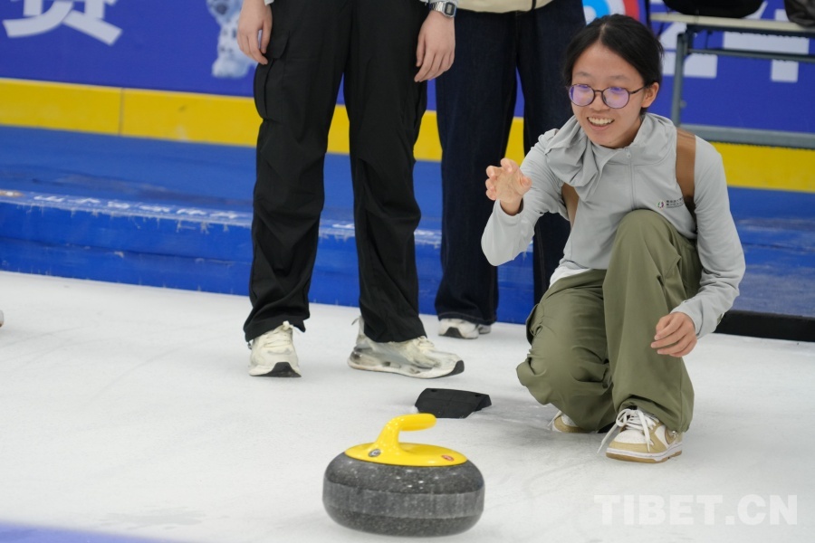 圖為曲文苑在體驗(yàn)冰壺運(yùn)動(dòng) 攝影:馮重霖