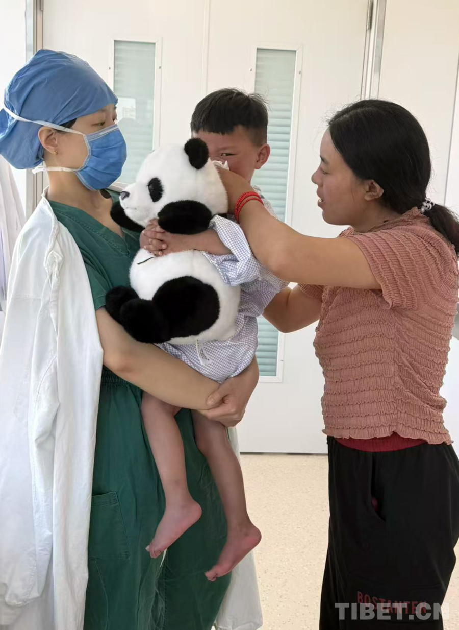 圖為北京口腔醫(yī)院醫(yī)護人員抱著斯曲卓瑪與母親強措臨時告別,準備到手術室進行下唇血管瘤的藥物注射治療(吉色2025年6月6日攝)