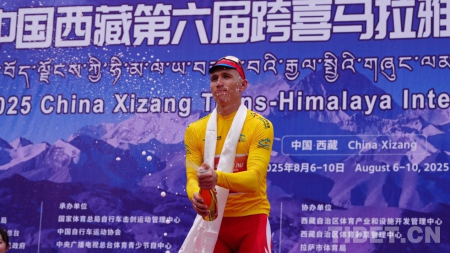 圖為2025中國西藏第六屆跨喜馬拉雅國際公路自行車極限賽林芝首賽段第一名TSISHKOU Raman在慶祝勝利 攝影:次旦拉姆