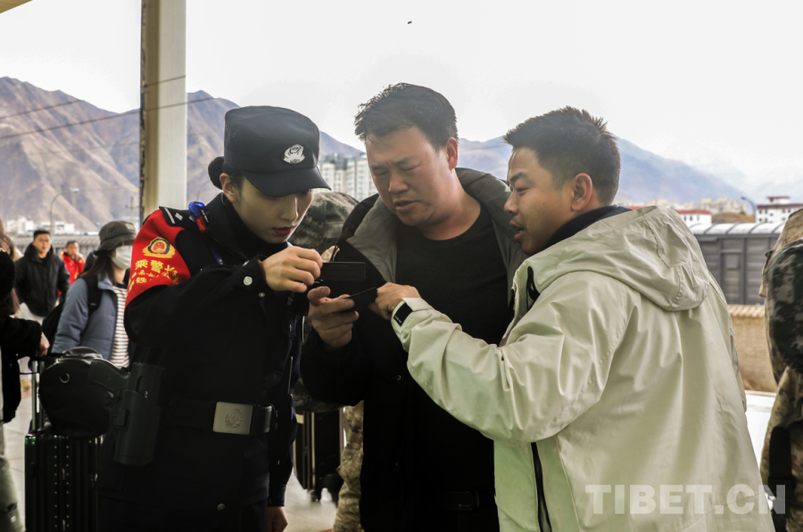 圖為米瑪次仁向旅客進(jìn)行安全提示 攝影:普布旦增