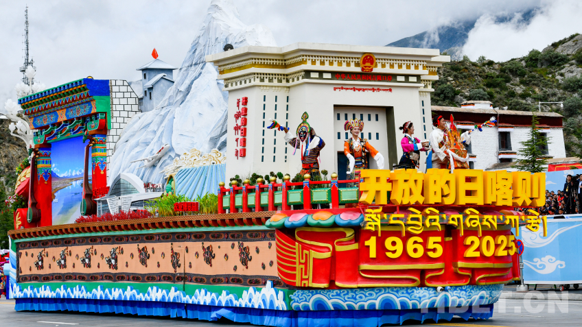 日喀則市彩車,彩車頭部為吉隆口岸造型,象征著日喀則作為面向南亞開(kāi)放中心城市的特殊戰(zhàn)略地位。國(guó)門前,兩名著定日服飾的地震災(zāi)區(qū)群眾代表,手捧切瑪,表達(dá)對(duì)以習(xí)近平同志為核心的黨中央的深深感恩之情。
