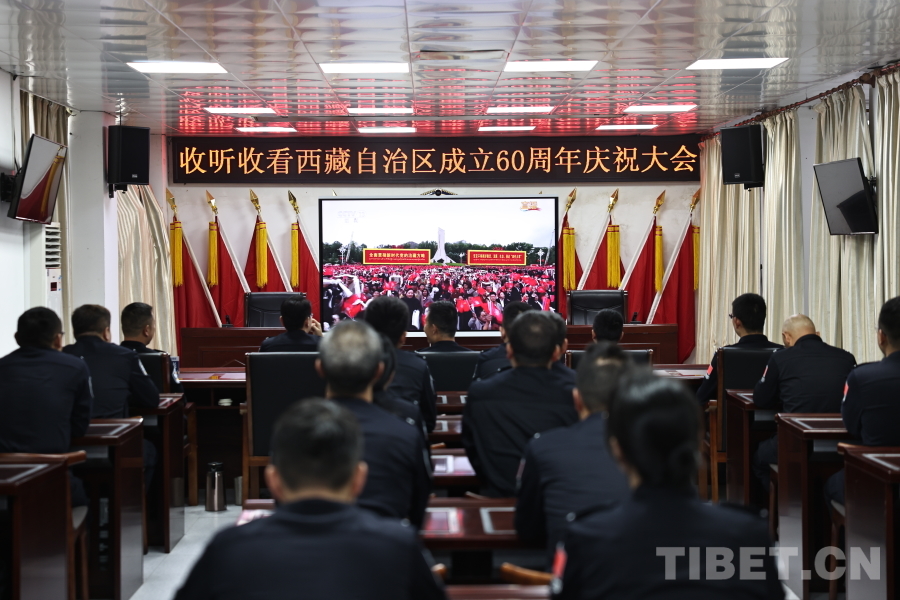 圖為聶拉木出入境邊防檢查站組織民警集中觀看西藏自治區(qū)成立60周年慶祝大會