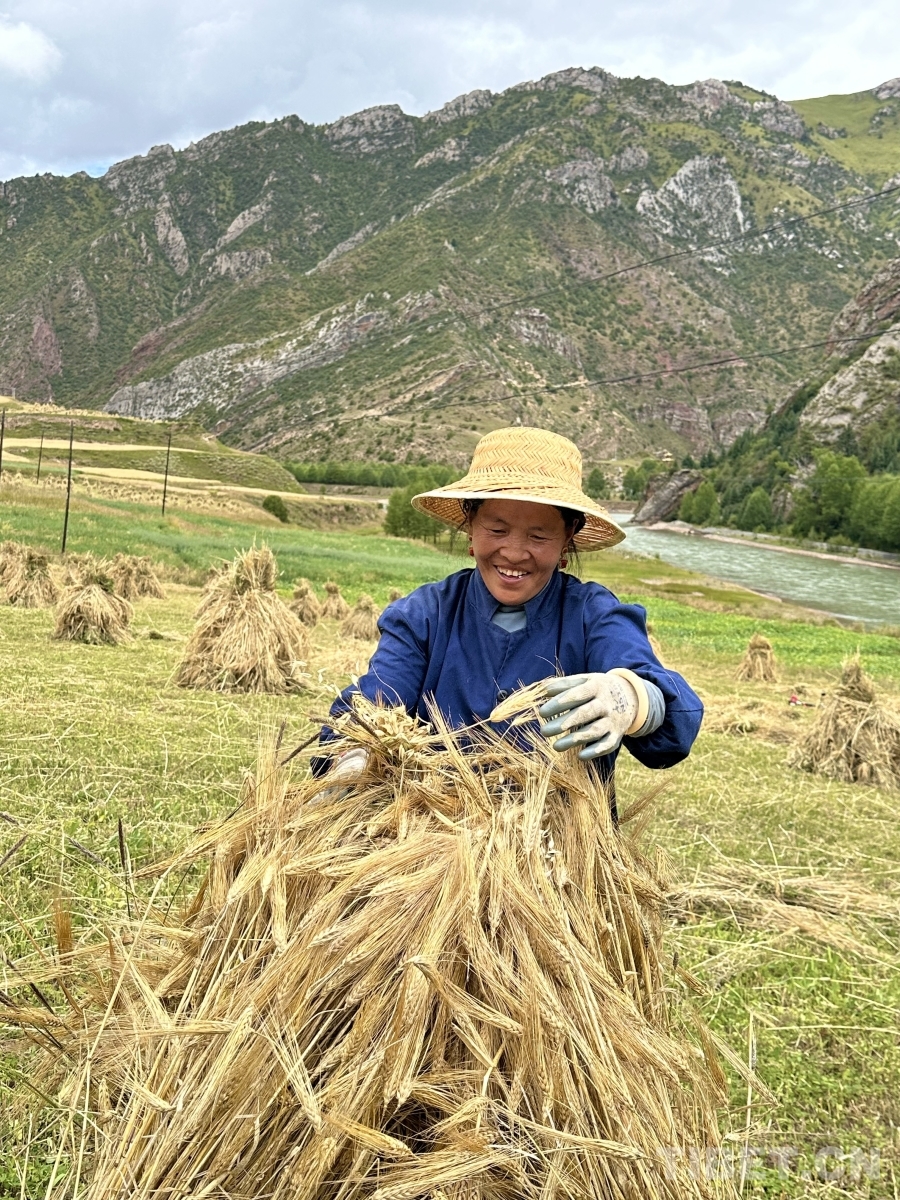中國(guó)西藏網(wǎng)訊 八月的青海省玉樹(shù)藏族自治州囊謙縣毛莊鄉(xiāng)孜榮村,青山疊翠,流水潺潺。瀾滄江支流孜曲河蜿蜒穿過(guò)村莊,滋潤(rùn)著兩岸廣袤的農(nóng)田。成熟的青稞田在高原陽(yáng)光下熠熠生輝,映照著農(nóng)牧民燦爛的笑容。在這片平均海拔超過(guò)4000米的土地上,村民們開(kāi)鐮收割黑青稞,處處洋溢著豐收的喜悅。