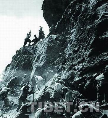 資料圖:十八軍筑路部隊(duì)在絕壁上鑿路
