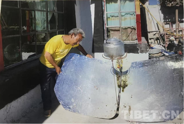 這個(gè)是太陽(yáng)灶,大概是2000年左右,基本上每家每戶(hù)都有一臺(tái)。我們屬于半農(nóng)半牧,生火用木材,消耗很大。有了這個(gè)太陽(yáng)灶后,不用木料,而且也很方便。但由于存在火災(zāi)隱患,后來(lái)就沒(méi)用。我們現(xiàn)在住的這套房子是2018年新建的,照片中的是2018年前的房子。