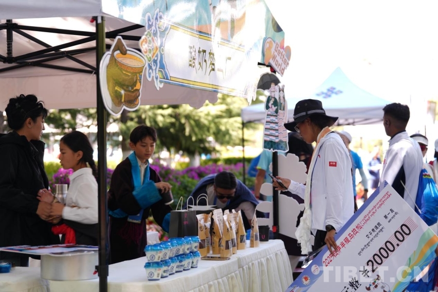 圖為特色展示區(qū)工作人員為參賽選手介紹西藏特色酸奶并贈送品嘗